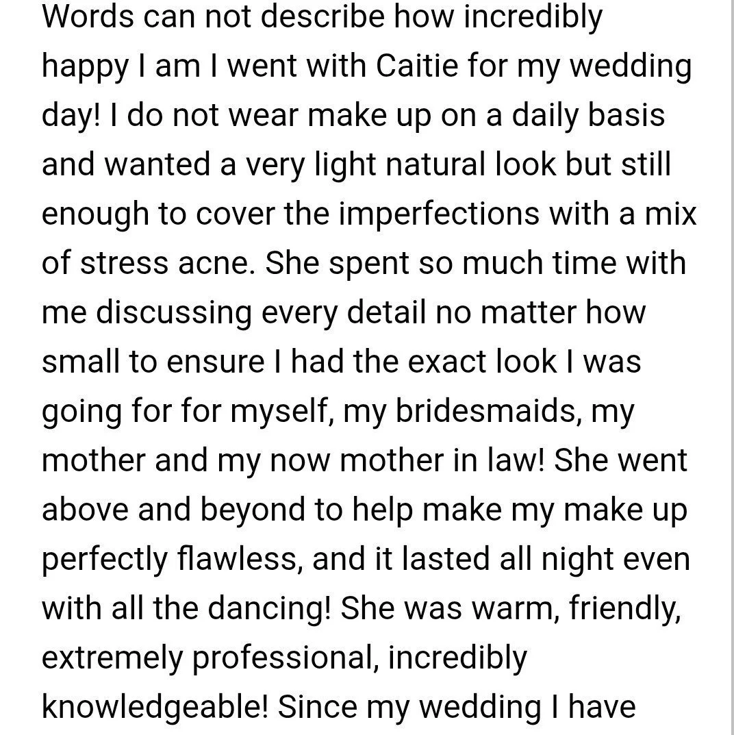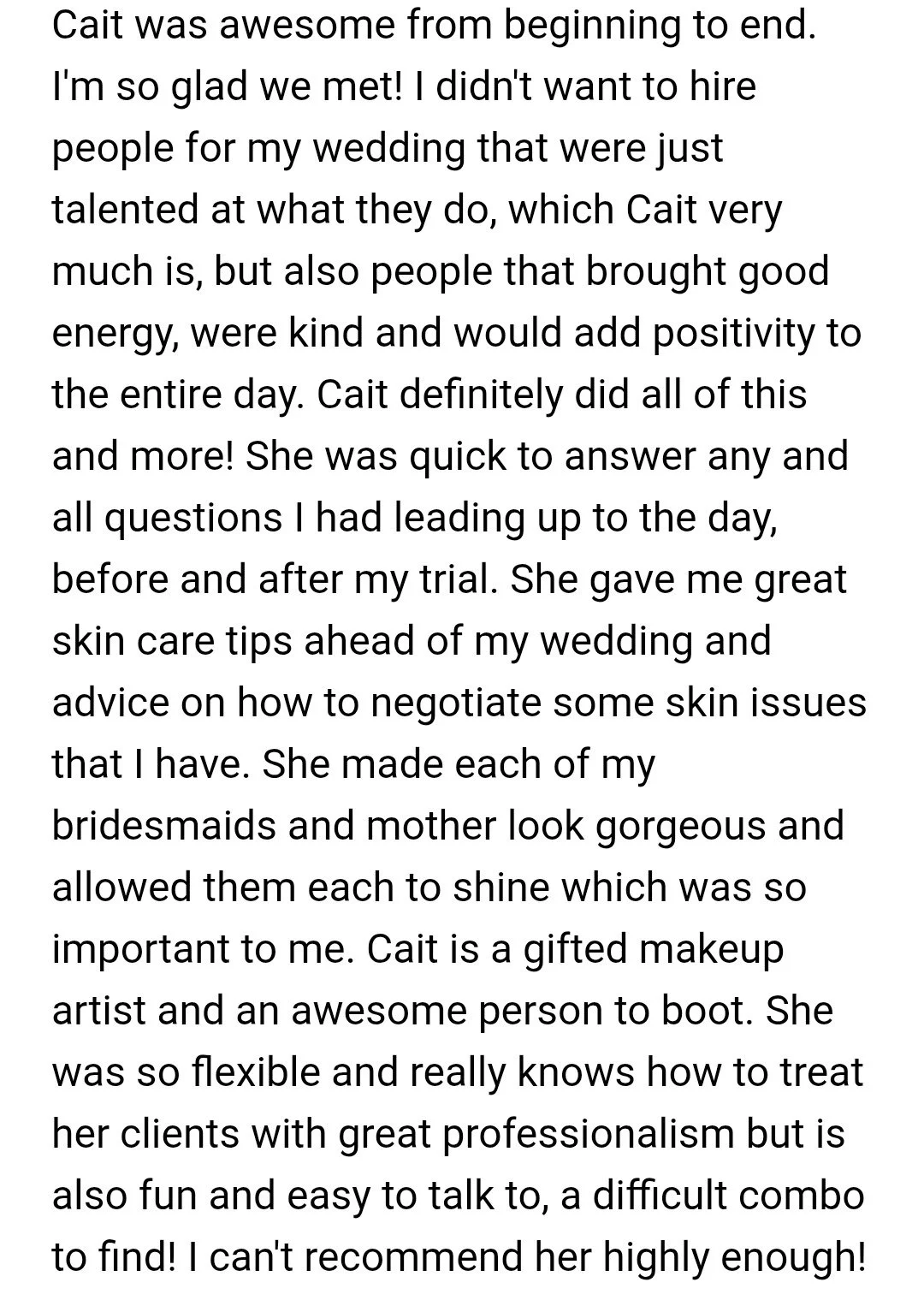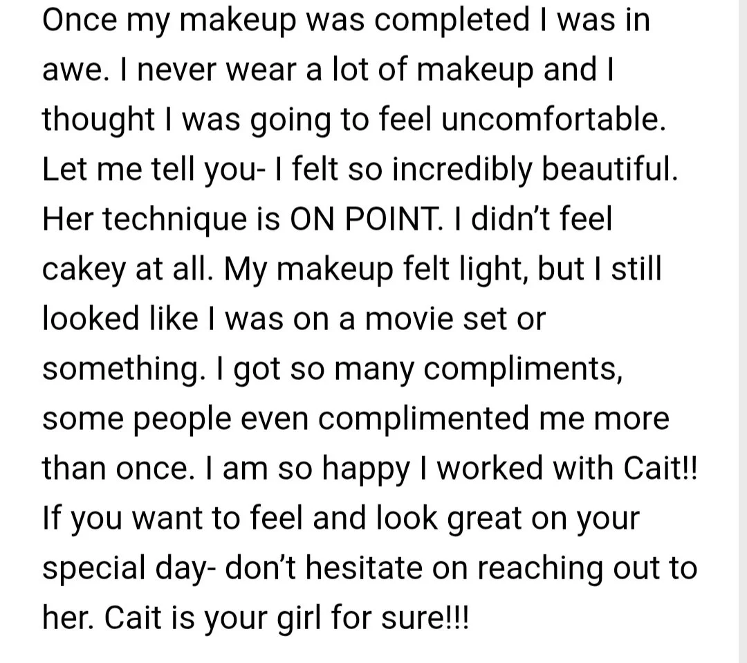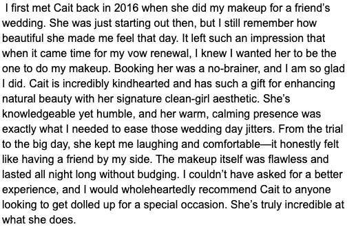 “I’m the bride who didn’t have a specific vision for what she wanted which honestly could have been a disaster if not for Cait. I’m also not one for filling out reviews but I am doing one today because my day would not have been as perfect with someone else. Cait created the perfect look for not only me but all of my bridesmaids.”